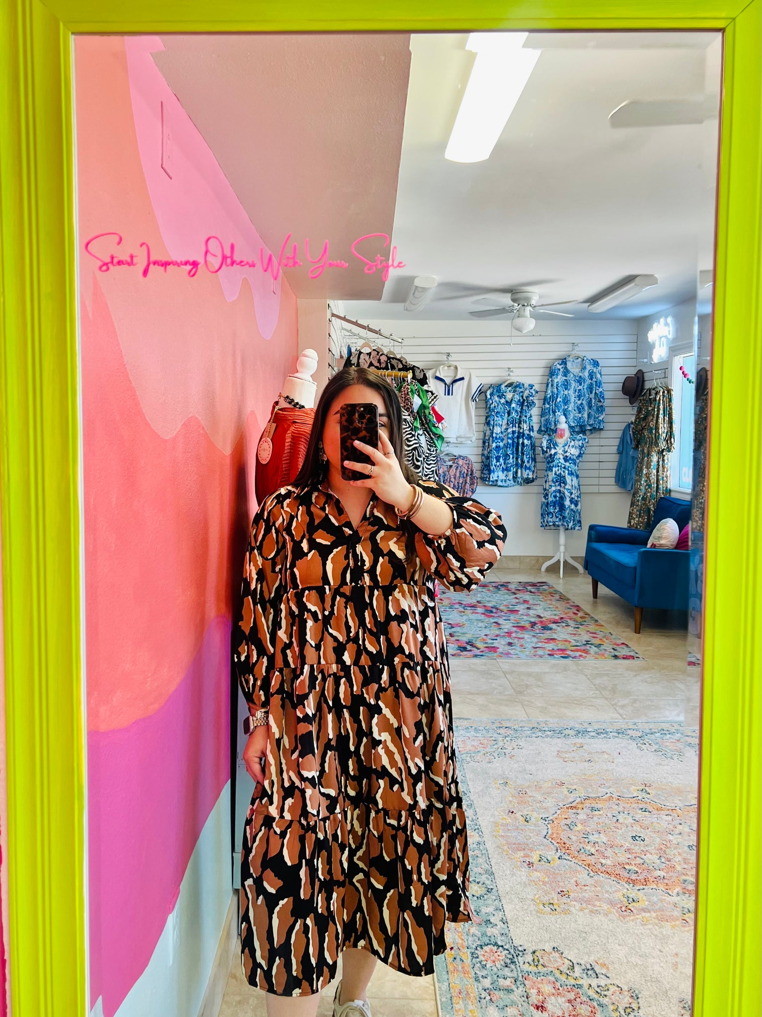 This one is so easy and flattering. A tiered, flowy midi silhouette with a fun abstract print that stands out without trying too hard. Features a v-neckline and relaxed sleeves for an effortless, comfy fit. Minimal stretch, but the flow gives you plenty of room.